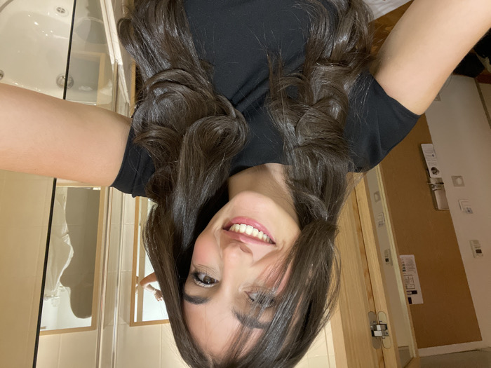 The image depicts a close-up selfie of a young adult female taken indoors in what appears to be a hotel room or similar accommodation within Marseille, France