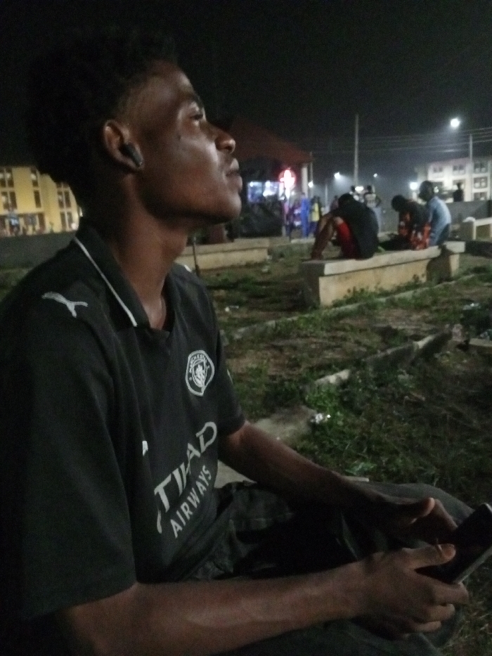 A young adult male, of dark complexion and with short, dark, curly hair, is depicted in profile, facing right and looking upward. He wears a dark short-sleeved collared shirt with a white stripe on the collar, a white Puma logo on the left shoulder, and a circular crest on the left chest with "MANCHESTER CITY" and a lion emblem, below which "ETIHAD AIRWAYS" is printed. A dark earbud is visible in his left ear. He is seated on the ground or a low surface, holding a dark-colored smartphone in his lap with both hands, thumbs positioned for interaction. The scene is set outdoors at night in Ihiagwa, Nigeria. The ground is sparsely covered with grass and dirt. In the middle ground, a series of light-colored concrete benches are visible. Three indistinct individuals are seated on one of these benches; one is hunched over wearing a dark shirt and red shorts, another wears a patterned top, and a third wears a light blue top. In the background, a multi-story building with illuminated windows is visible on the left. Further right, another building and streetlights illuminate the distant background. A red illuminated sign is also visible in the mid-background. The overall lighting is dim, suggesting nighttime conditions with artificial light sources.