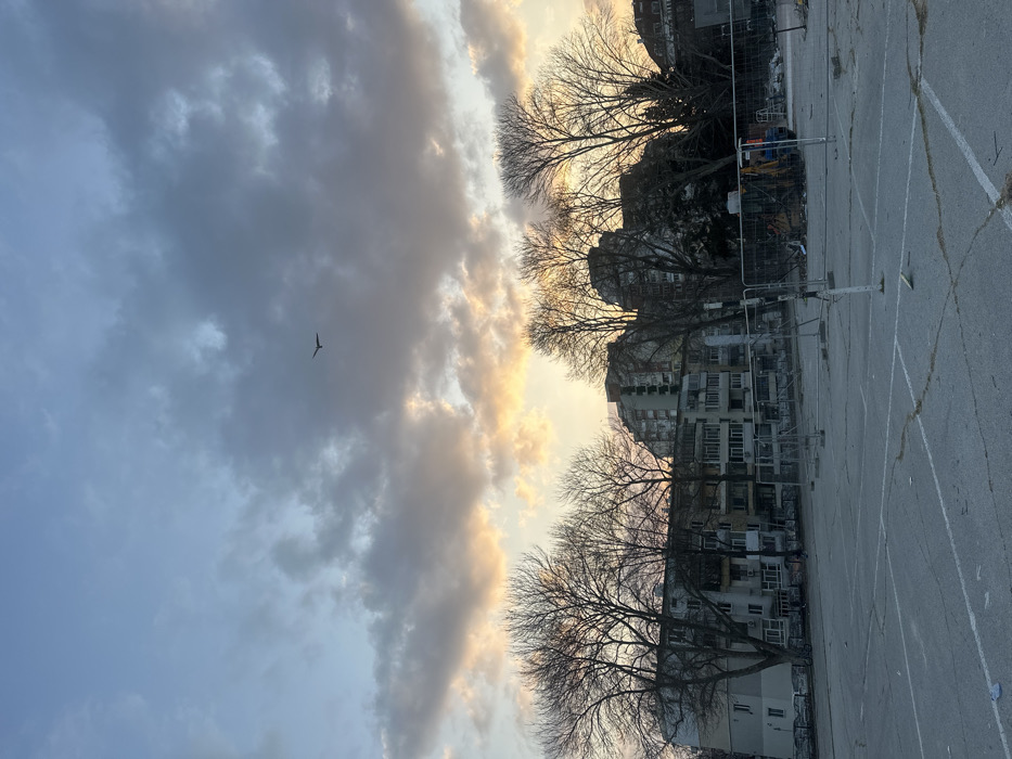 The image displays an urban outdoor scene in Varna, Bulgaria, captured during twilight, indicated by a horizontal band of orange and pink light on the horizon against an otherwise overcast sky with dark grey clouds. In the foreground, a large, cracked asphalt surface, possibly a former parking lot or sports court, shows faint white markings and scattered small debris. Multiple temporary metal barrier fences delineate the mid-ground, separating the asphalt from an apparent construction or demolition site. Within this fenced area, heavy machinery, specifically an excavator, is partially visible among piles of rubble and discarded materials. Behind the construction zone, a row of deciduous trees with bare branches stands before multi-story residential buildings, characterized by balconies and varied facades. A single, dark bird is silhouetted in flight against the cloudy sky in the upper left quadrant. No human figures are present.