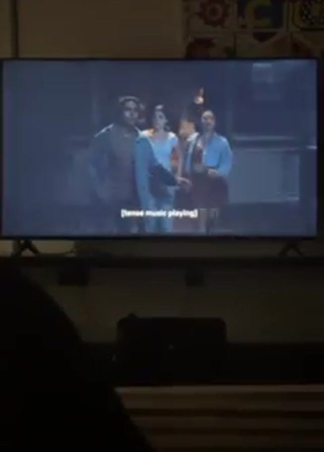 A person is watching a TV in a dimly lit room. The TV shows a scene of a movie or TV show with three young adults. A man is on the left, a woman in the middle, and another woman on the right. The subtitle at the bottom of the screen says "I'm gonna go check it out" and "Okay". There is a piece of decorative art hanging on the wall behind the TV.