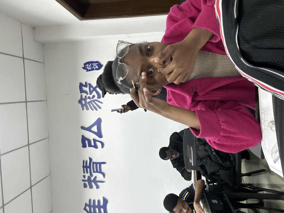 The image portrays an interior scene within a classroom or training facility in Jiangjin, China. The white wall displays large blue Chinese characters "弘毅" (Hóng Yì), accompanied by smaller characters "校训" (Xiàoxùn), indicating a school motto or training context. In the immediate foreground, a dark-skinned female individual is seated at a desk, wearing a bright fuchsia-pink jacket over a beige ribbed top. Clear-rimmed glasses rest on her forehead. She holds a pencil near her right eye with her right hand, while her left hand covers her mouth and nose. Her eyes are wide, directed towards the camera. Behind her, another dark-skinned individual, wearing a black cap and dark attire, is visible, holding a black smartphone vertically with their right hand, seemingly capturing an image or video. To the left mid-ground, a dark-skinned male in a black and yellow striped shirt is seated at a desk, looking down at a task. Further in the background, another dark-skinned male in a black long-sleeved shirt is seated at a desk, also focused downwards on an object or document. The desk in the foreground holds a sheet of paper with visible markings, a small white object (possibly an eraser or dice), and a portion of a black bag with white and red stripes. The scene depicts multiple individuals engaged in activities within a structured educational or instructional setting.
