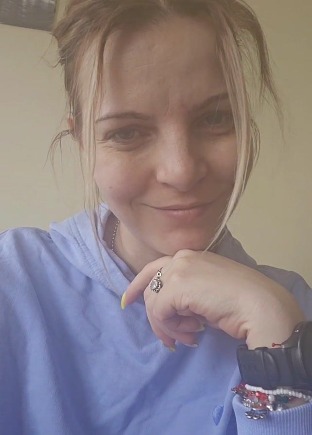 A woman with blonde and brown hair, wearing a blue hoodie, looks at the camera. Her hair is pulled back in a messy bun with some strands framing her face. She is wearing a silver ring and a watch with colorful bracelets. Her nails are painted yellow. She rests her chin on her hand and smiles slightly. The background is a plain wall with a small picture hanging in the upper left corner. She then raises her hand slightly. The overall lighting is soft and natural.