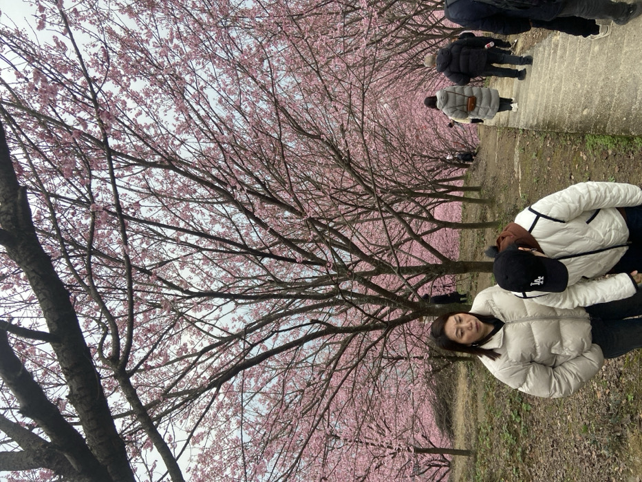 A row of blossoming cherry trees fills the frame, the pink flowers creating a vibrant canopy overhead. A group of people is walking along a pathway to the right of the trees. Two women in winter jackets are posing in the right foreground. The ground is a mix of dirt and grass. The tree trunks are dark and contrast with the pink blossoms. The sky is visible through the branches, appearing as a light blue backdrop.