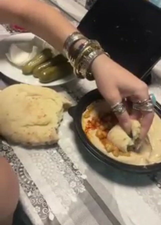 woman sitting at a table with a meal of hummus, pita bread, pickles, and sliced onion. She is wearing multiple rings and bracelets. She dips a piece of pita bread into the hummus and eats it. The table has a gray and white geometric patterned tablecloth. A glass of red liquid is also visible on the table. A tablet or similar electronic device is propped up behind the food.