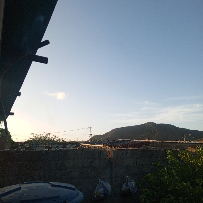 A landscape features a low concrete wall in the foreground with two bags hanging from it. Behind the wall, there are scattered buildings and vegetation leading up to a dark, imposing mountain in the distance. The sky is light blue with a few wispy clouds, suggesting it could be early morning or late afternoon. Part of a building is visible in the upper left corner, indicating an urban or semi-urban environment.