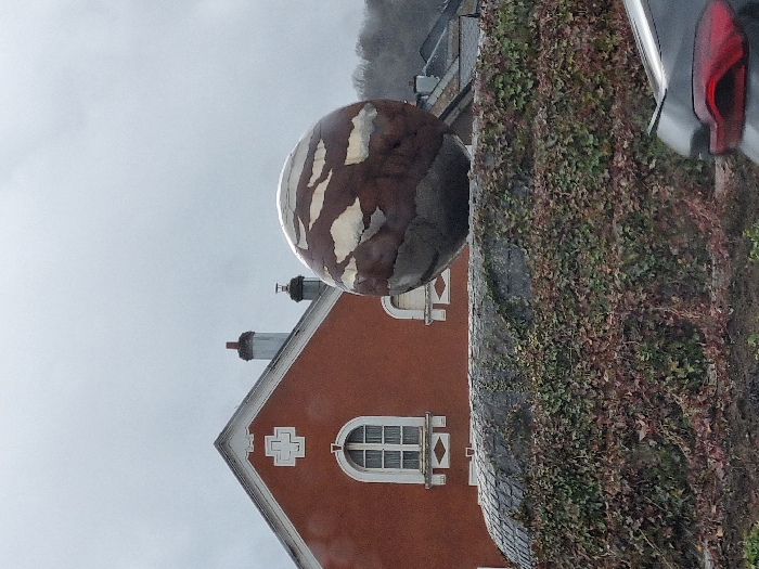 An outdoor scene in Differdange, Luxembourg, is depicted under an overcast sky. A large, spherical sculpture, approximately 2-3 meters in diameter, is centrally positioned in the midground. It exhibits a mottled surface with irregular patches of dark reddish-brown and metallic silver-grey. The sphere is elevated, resting above a stone wall heavily covered in dense green and reddish-brown ivy, which forms a prominent natural barrier across the lower half of the image. Behind the sculpture and the ivy-covered wall, a building with a red-orange facade and a gabled roof is visible. This building features white trim along the roofline, arched windows with white frames, and a distinctive white cross-shaped architectural motif centered on its gable. To the right of this building, several grey tiled rooftops are discernible. In the distant background, a line of trees or forested hills is visible under the muted light of the overcast sky. The lower right foreground shows the rear section of a dark-colored vehicle, including its bumper and a red taillight, partially obscured by the ivy. No individuals are present in the scene.