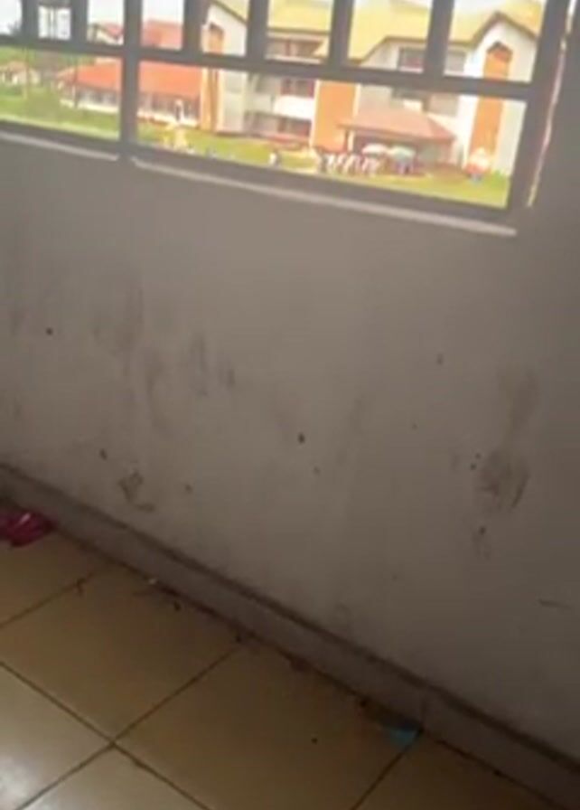 view through a barred window of a building with a red and white exterior. Outside the window, a group of people are walking on a grassy area. There are also small booths or stalls visible in the background. The room from which the video is taken has tile flooring and a wall with some discoloration and peeling paint. The day appears overcast with a cloudy sky.