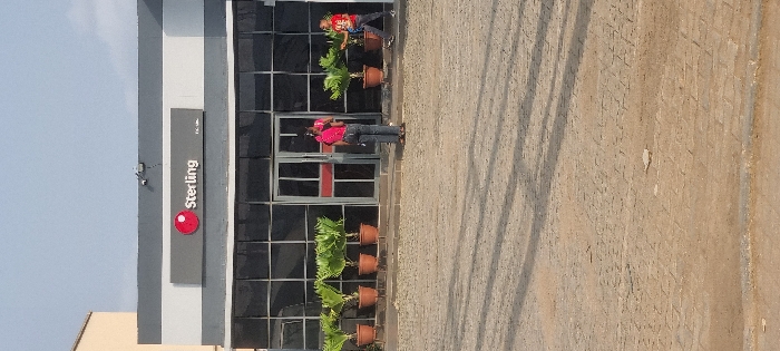 A Sterling Bank branch is pictured. The modern building features a gray facade with a prominent Sterling logo. Large, grid-patterned windows line the front. Potted plants flank the entrance, adding a touch of greenery. Two people stand near the entrance, while another is positioned slightly farther away to the left. A wide, light-colored pavement stretches in front of the building, indicating a clear outdoor space.