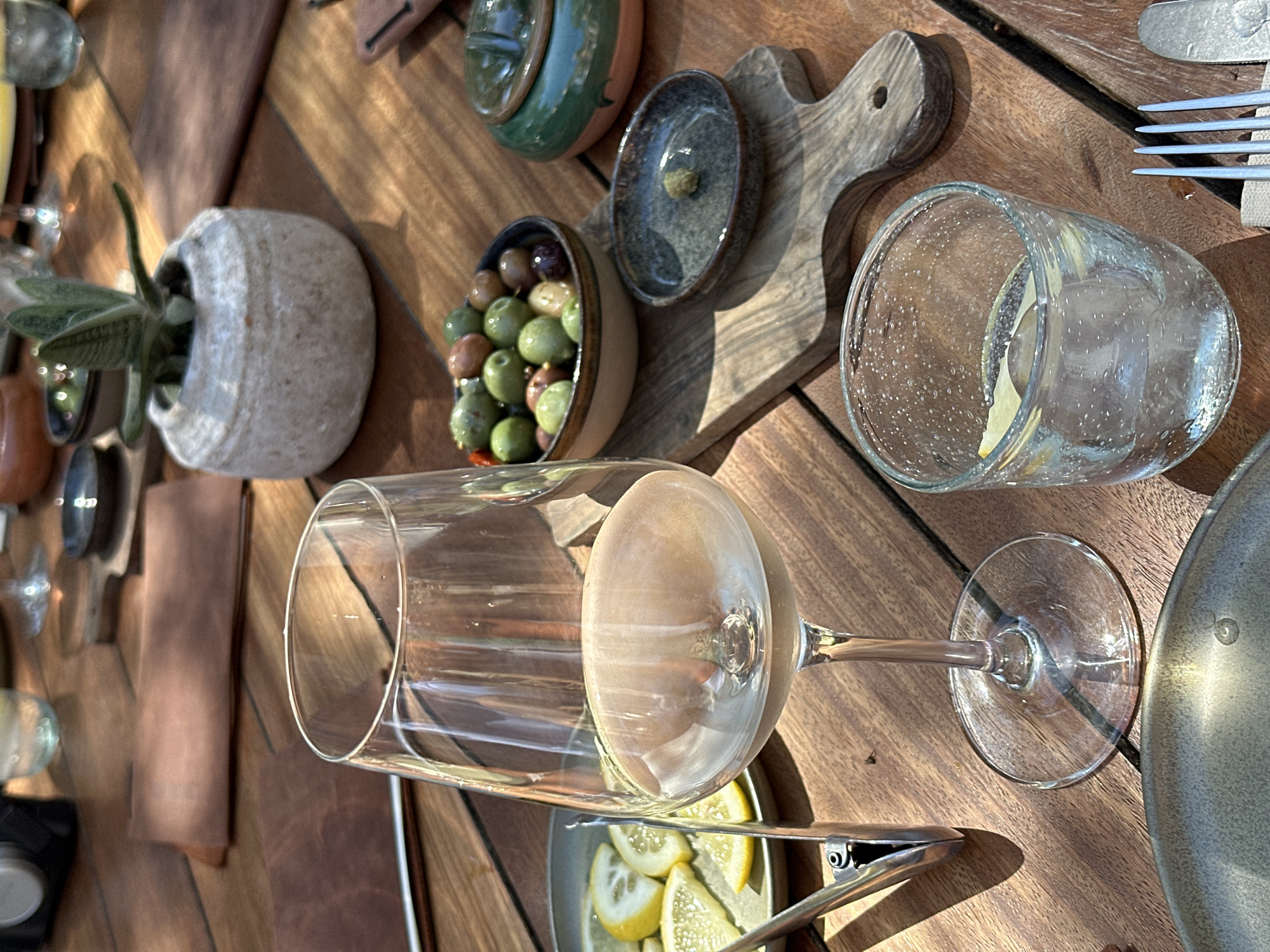 A high-angle shot displays a table setting at a dining establishment, possibly outdoors, featuring wooden surfaces indicative of a rustic or Mediterranean theme. The composition includes several items: a potted succulent plant, a small bowl filled with green and brown olives, a lidded jar, a small dish, a wooden cutting board, a glass of liquid with lemon slices and possibly ice, a wine glass lying horizontally across the table, lemons in a dish with a server, a set of utensils (knife and fork), a brown napkin, and a gray plate. This setting suggests an al fresco dining experience, potentially in a casual or informal restaurant setting. Given the mention of Sant Antoni de Portmany, Spain, it is plausible this scene takes place at a cafe, restaurant or bar in that location, offering food and drink to customers. There are no people visible in the frame.