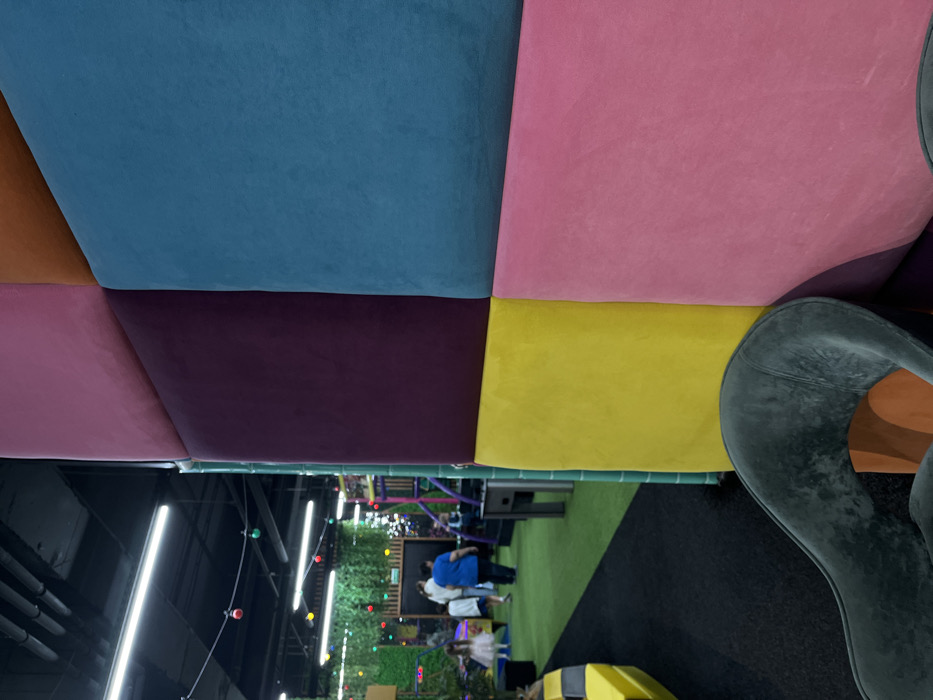 A vibrant, upside-down scene displays a colorful ceiling comprised of square-shaped panels in shades of orange, blue, pink, purple, and yellow. Below, an indoor play area features artificial greenery, playground equipment, and people. Fluorescent lights hang from the dark ceiling above the play space. A gray, curved chair back adds a contrasting element on the right side of the view.