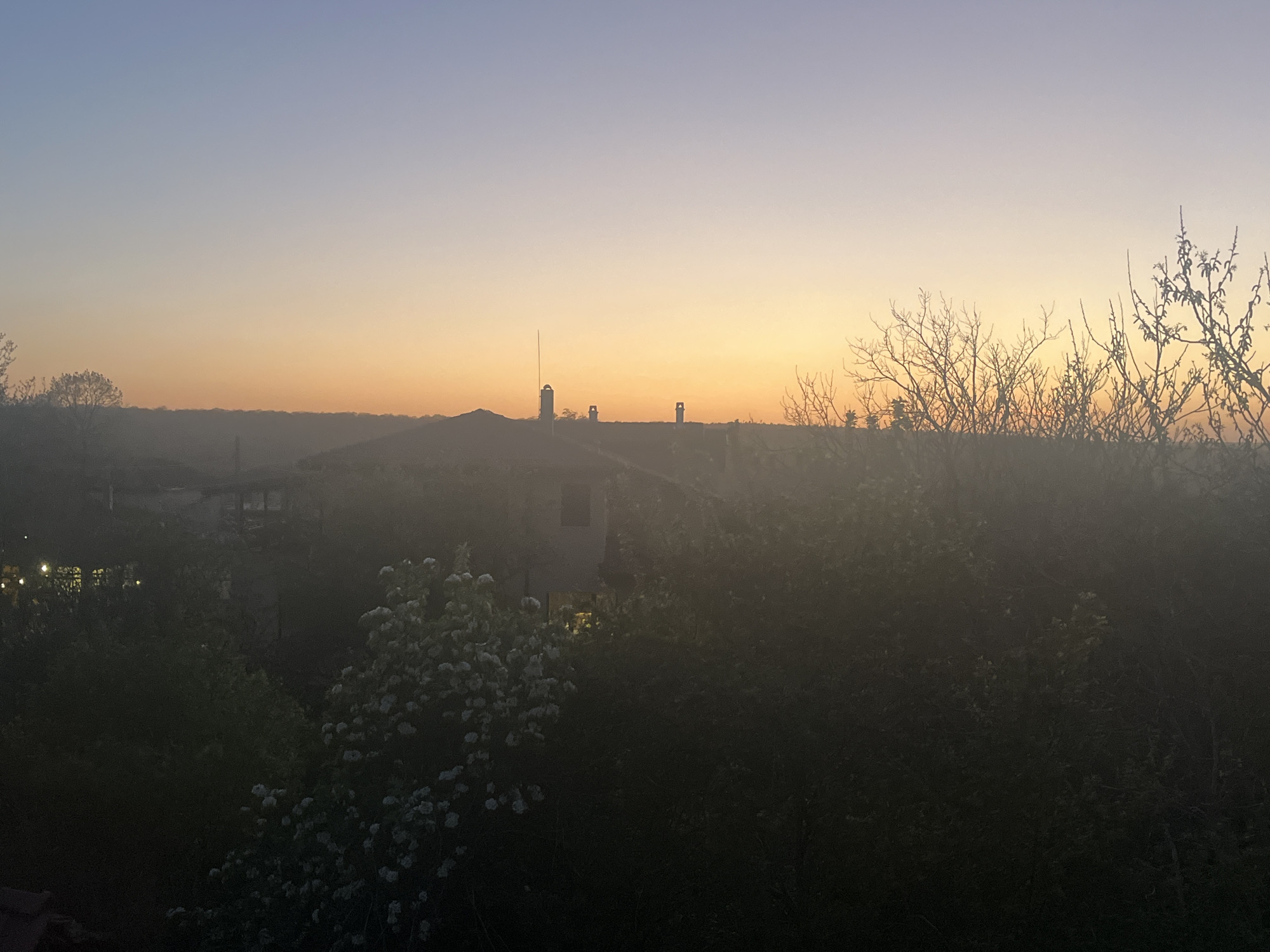 The image depicts a scene at dawn or dusk in Oreshak, Bulgaria. The sky transitions from a light blue at the top to a yellowish-orange near the horizon, indicating either sunrise or sunset. The visibility is low due to fog or haze, which obscures the lower portion of the frame. In the middle ground, the silhouettes of rooftops with three chimneys and an antenna are visible. Beneath them, there are buildings with faint lights emanating from windows. The foreground consists of dense vegetation, including trees and flowering bushes, which are mostly dark and indistinct due to the low light conditions. A cluster of white flowers can be seen in the lower left portion of the frame.