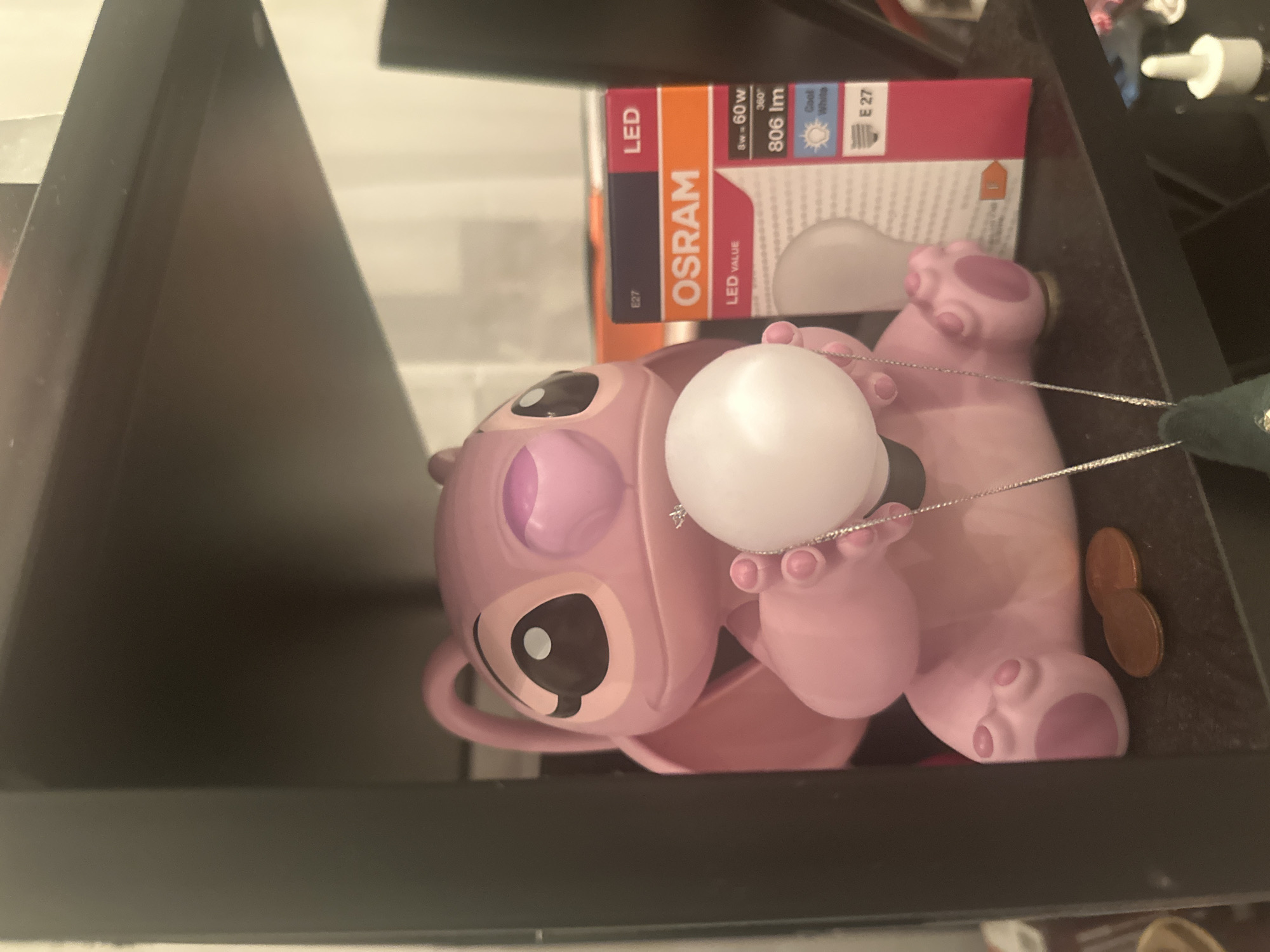 A pink figurine, styled as Angel from Disney's Lilo & Stitch, sits prominently on a dark-colored shelf in the city of Varna, Bulgaria. The figurine holds a small, white, spherical object in its raised hands, from which a silver-colored chain with a dark green or blue pendant descends out of frame. To the right of the figurine, an OSRAM LED VALUE light bulb box is displayed, showing specifications such as "E27," "LED," "8W=60W," "360°," "806 lm," and "Cool White." Two copper-colored coins rest on the shelf directly to the left of the figurine's base. A white dropper bottle cap is partially visible in the lower right corner of the frame. The shelf is part of a dark-toned shelving unit, with vertical supports visible on either side of the display area.