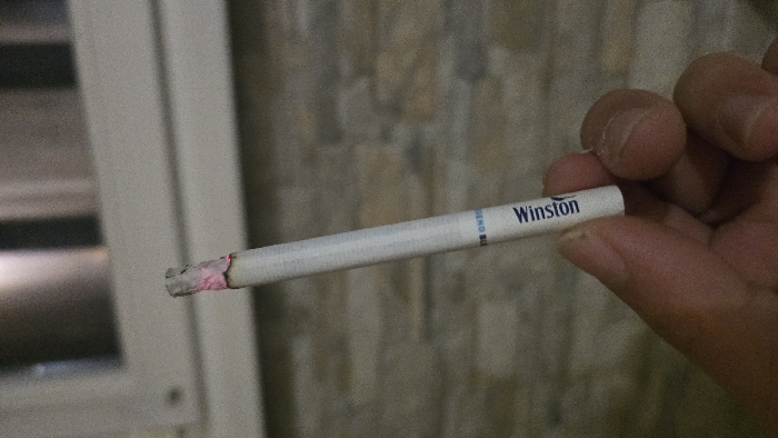 A close-up photograph shows a human hand holding a lit cigarette. The cigarette features a white filter with a blue "Winston" logo and partially visible text "BLEND BU" on the stick. The tip is actively burning, displaying a red glow and a small amount of ash. The hand grips the cigarette between the thumb and index finger, revealing a light-to-medium skin tone. The background consists of a textured wall, appearing to be stone or brick in varying shades of grey and brown, with a blurry, light-colored horizontal frame or structure visible in the upper portion. Illumination is ambient, contributing to visible digital noise in the image. No specific landmarks or distinguishing features are present to confirm a precise location within the city of Pleven, Bulgaria.