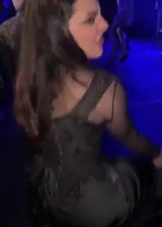 woman with long brown hair dancing in a black dress with fishnet sleeves. She is wearing a corset-style top. She has a big smile on her face and looks like she is having fun. There are other people in the background. The lighting is mostly blue, and there's stage lighting with some green tones. There seems to be a band playing on stage.