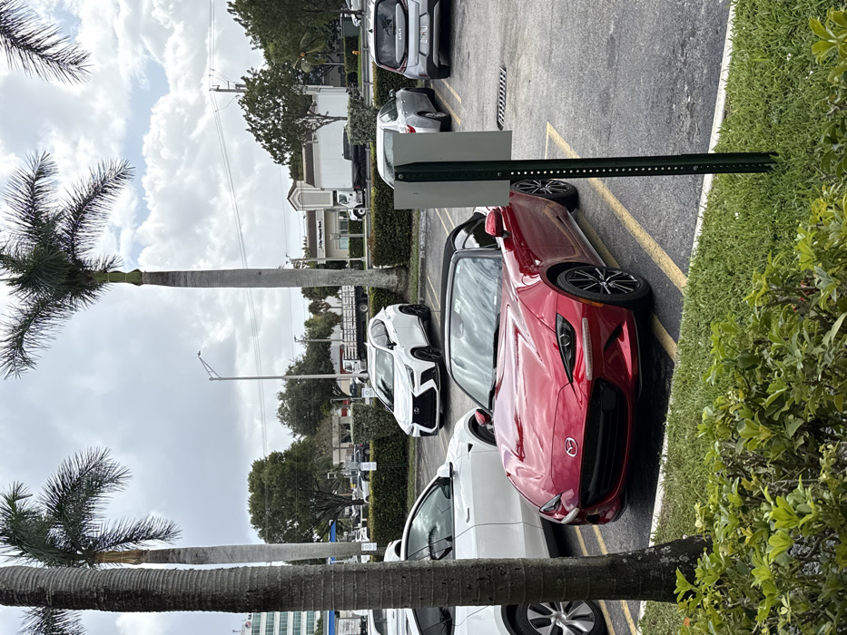 A parking lot with several cars parked in a row. A red Mazda Miata stands out. A white sedan is next to it. A white coupe is behind the Miata. A white commercial truck and other cars fill the remaining spaces. Palm trees line the perimeter. A green bush is on the right side. The sky is overcast.