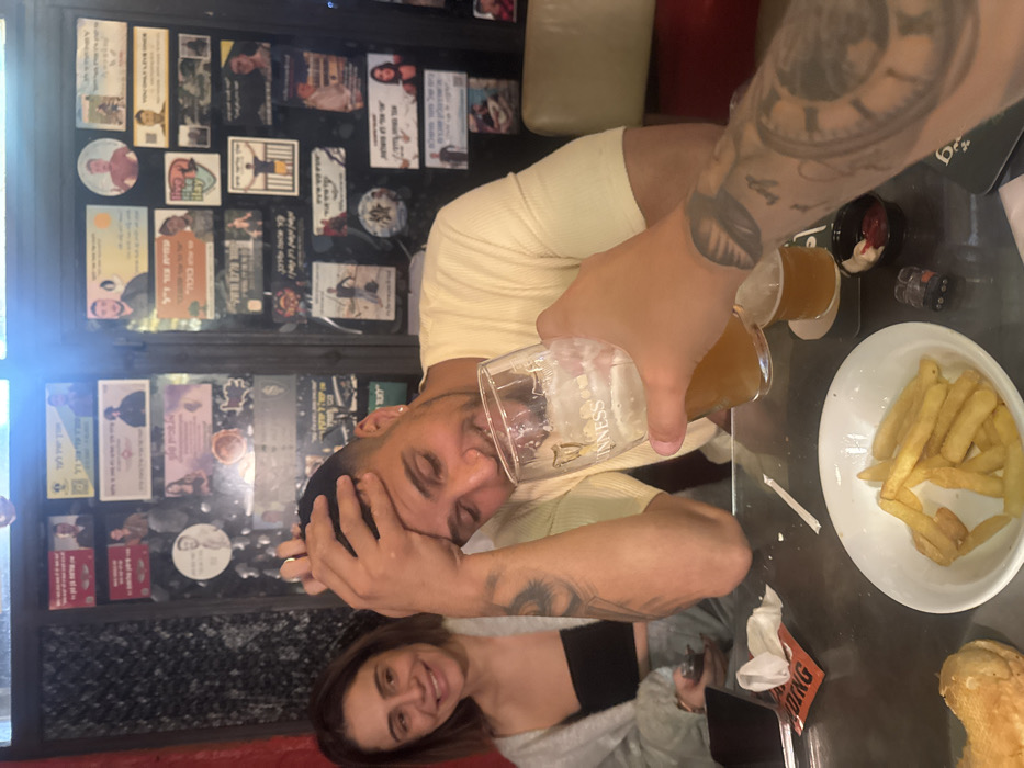 The image captures an indoor social scene, likely within a bar or pub in Rishon LeZion, Israel. Three individuals are visible. In the immediate foreground, a heavily tattooed arm, displaying a clock face design, holds a Guinness-branded glass containing a light amber liquid (beer) with foam, seemingly raised for a toast. In the middle ground, a male with short dark hair, a nose stud, and an ear stud, wears a light yellow ribbed short-sleeve shirt. He is smiling or laughing, with his mouth open, and his right hand is placed on his head. Tattoos are visible on his right arm. To his left and slightly behind, a female with light brown hair smiles directly towards the camera. She wears a black top under a light grey open cardigan and holds a dark mobile device in her left hand. The individuals are seated at a dark-surfaced table, possibly black glass. On the table, a white ceramic bowl contains french fries. Adjacent to the fries is a small black plastic condiment container with two compartments, one holding red sauce (ketchup) and the other white sauce (mayonnaise), accompanied by two dark shakers. A smaller glass of beer is also present on the table. A crumpled white paper napkin and a partially visible red and white sign displaying the word "DOING" are situated to the left of the fries. The background features a dark wall, part of which is a framed structure densely covered with numerous stickers, photos, and posters, many featuring Hebrew text and images of individuals. Red upholstered seating is partially visible in the far right background.