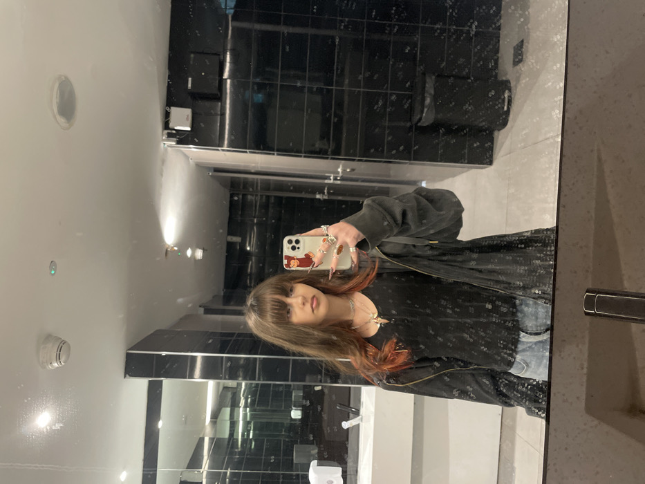 A mirror selfie depicts a young woman with brown hair and bangs, red highlights, and long nails adorned with multiple rings. She wears a dark sequined shirt and a jacket, holding her phone with a patterned case. The reflection shows a restroom setting with black tiled walls, fluorescent lights, a sink area, and stall doors. The overall image quality is slightly grainy.