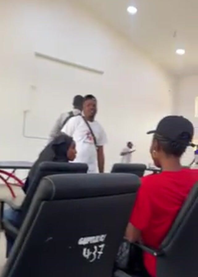 n indoor space with several people. Some are standing and talking while others are seated. There are rows of black chairs, and the walls are painted white. Some of the individuals standing are wearing white t-shirts. One person is wearing a red t-shirt and a black cap. The lighting is bright, possibly due to overhead lights and natural light coming in through the windows. The camera then focuses on the person wearing the red shirt and black cap.