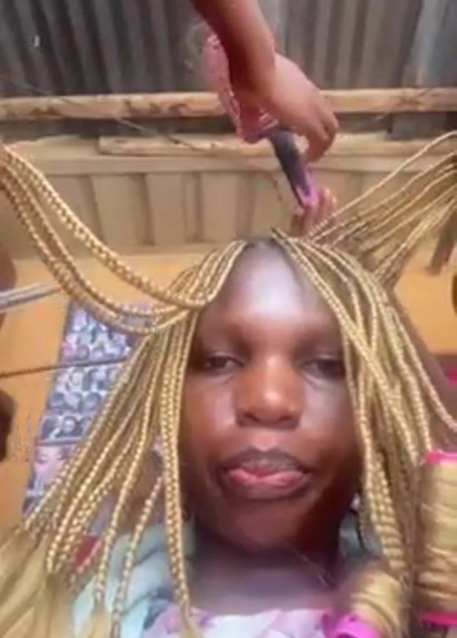 A woman is the primary focus of this close-up video. Her face is centered in the frame as she puckers her lips and poses for the camera. She is wearing light makeup and has blond braided hair, with some sections rolled into pink curlers. Two pairs of dark-skinned hands are visible around her head, holding and arranging the braids. One hand is using a pink brush to style the hair. The video appears to be taken outdoors, judging by the corrugated metal roofing overhead. A poster or photograph is visible in the background.
