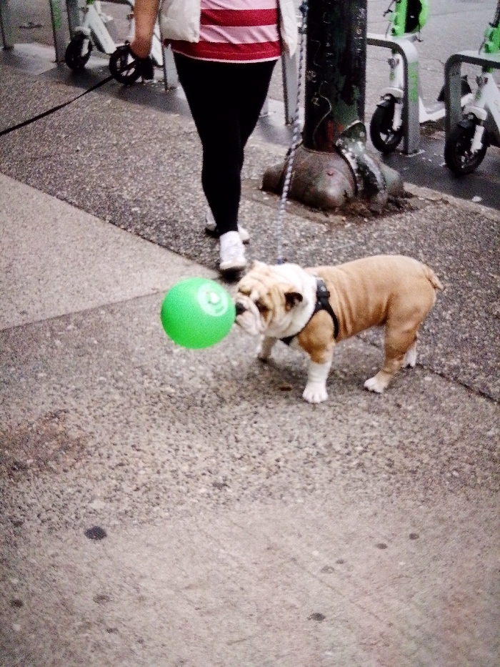 The scene depicts an urban sidewalk in Lares, United States of America. A person, partially visible from mid-thigh down on the left side, walks right-to-left. They are dressed in a light-colored vest over a pink and white horizontally striped shirt, black leggings, and white athletic shoes. A black leash extends from the person's left hand to a fawn and white English Bulldog, wearing a black harness, standing on the right side of the frame. The bulldog's snout is positioned directly in front of a bright green spherical object with a circular indentation. The ground is a paved sidewalk, showing a transition between two grey concrete textures: a coarser aggregate on the right and a finer aggregate on the left. In the background, a dark utility pole with a damaged, ornate base and a chain wrapped around it is visible. Behind the pole, three partially visible white electric scooters with lime green accents are parked in metal racks.
