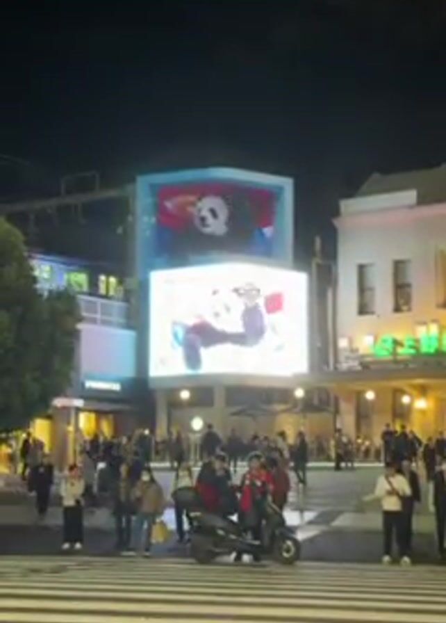 busy city intersection at night, with pedestrians, scooters, and buildings clearly visible. The focus is on a pair of large, stacked video screens displaying a 3D animated panda bear. The panda appears to be interacting with the screen, as if reaching out. Buildings and businesses, including a Starbucks, are visible in the background. Many people are waiting at a crosswalk. Traffic moves across the screen.