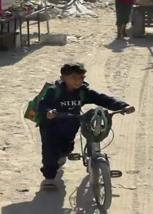 street in a war-torn area. A boy wearing a Nike sweatshirt and a backpack is walking, holding a bicycle with a helmet attached to the handlebars. He looks back and speaks. Further down the road, there are donkey-pulled carts carrying items. People are walking on the sandy road, and destroyed buildings are visible in the background. The scene suggests a place where life continues amidst destruction.