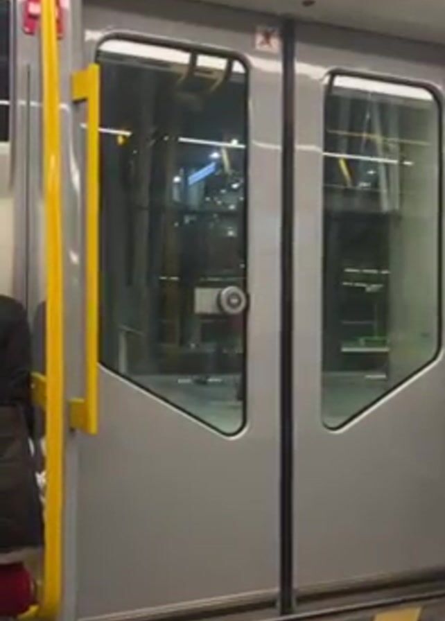 interior of a train, with a focus on a closed set of gray doors with triangular windows. A yellow handrail is visible on the left side of the doors. A person wearing a black jacket and carrying a bag stands to the left of the frame, next to the handrail. Through the windows, a station platform can be seen. The doors then slowly open and a person in a red jacket walks by.