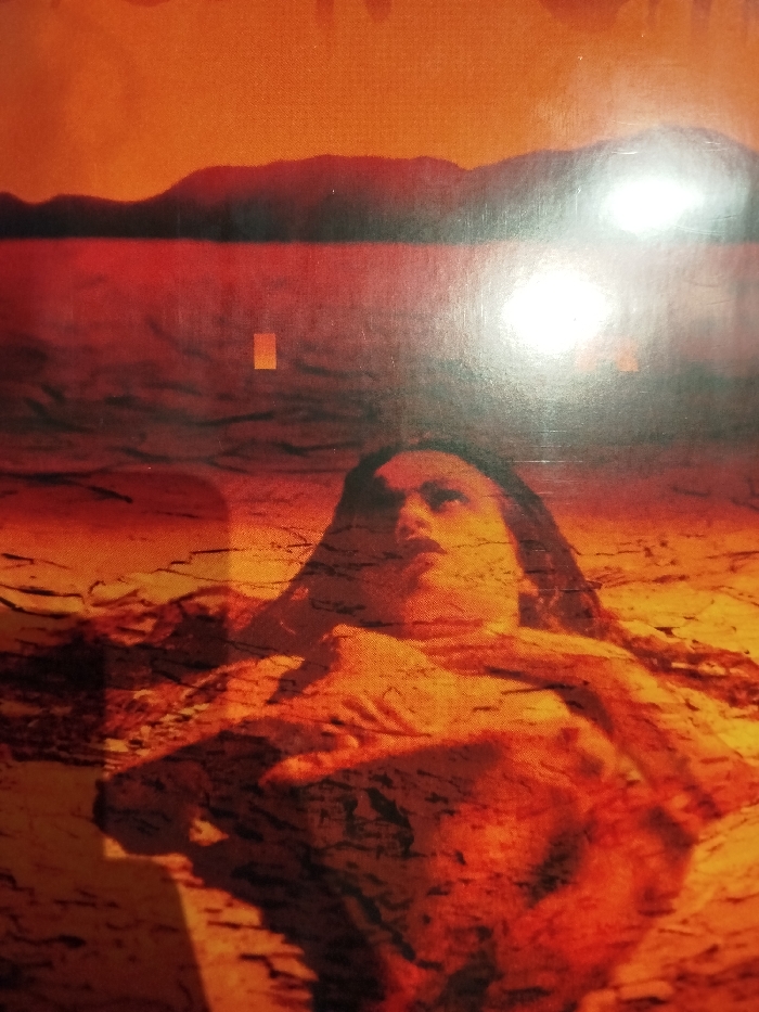 The image presents a highly stylized scene dominated by deep red and orange tones. In the foreground, the head and upper torso of a female individual emerge from a dark, textured surface resembling either cracked earth or liquid. Her dark hair is visible, and her face is angled upwards and slightly to the left, with her eyes open. Her right arm is bent across her chest, and her left arm extends outward. The visible skin surfaces exhibit a mottled, textured appearance. Behind the individual, a broad expanse of deep red-orange water or liquid occupies the midground, reflecting a distinct, bright light source positioned slightly right of the frame's vertical center. A small, light-colored rectangular object is visible on this surface, left of center. In the background, a dark, silhouetted landmass or mountain range spans horizontally against an orange sky. The entire composition is bathed in a monochromatic, low-light aesthetic, indicative of a strong color filter or twilight conditions. No specific landmarks are discernible to precisely identify a location within Lisbon, Portugal.