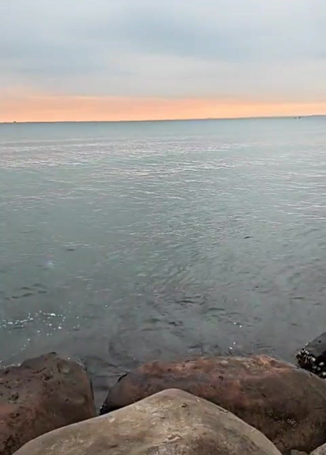 The scene is a still shot of the ocean. At the bottom of the frame are some dark, smooth rocks. The ocean itself is a muted grey-blue color. In the distance, the sky meets the ocean at the horizon. There is a band of peach-orange color on the horizon where the sun appears to be setting or rising. The sky above this is a pale grey with clouds. The water is relatively calm, with slight ripples visible. There is no sign of people.