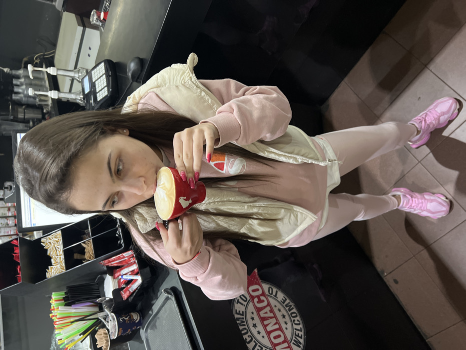 A young female, appearing to be in her late teens or early twenties with long dark brown hair, is captured from a high-angle perspective, positioned inside what appears to be a cafe or coffee shop in Lovech, Bulgaria. She is actively drinking from a red ceramic mug with a white dog silhouette graphic, which contains a beverage topped with frothed milk displaying latte art in the shape of a heart. Her fingernails are painted bright pink with subtle embellishments. She is dressed in a light pink long-sleeved top, a light beige/cream quilted vest, light pink leggings, and light pink athletic shoes with white soles. The background features a dark counter setup. To the left of the subject, a black organizer holds various items including colorful plastic straws, small paper cups, and individually packaged sugar or sweetener packets. A black service tray is visible on the counter. Below the counter, a partially visible sign reads "WELCOME TO MONACO" in white and red lettering with white stars. To the right, the black counter displays several pump-top syrup dispensers and a black point-of-sale terminal. A computer monitor screen is partially visible further back. The floor beneath the subject is tiled with light-colored square tiles.