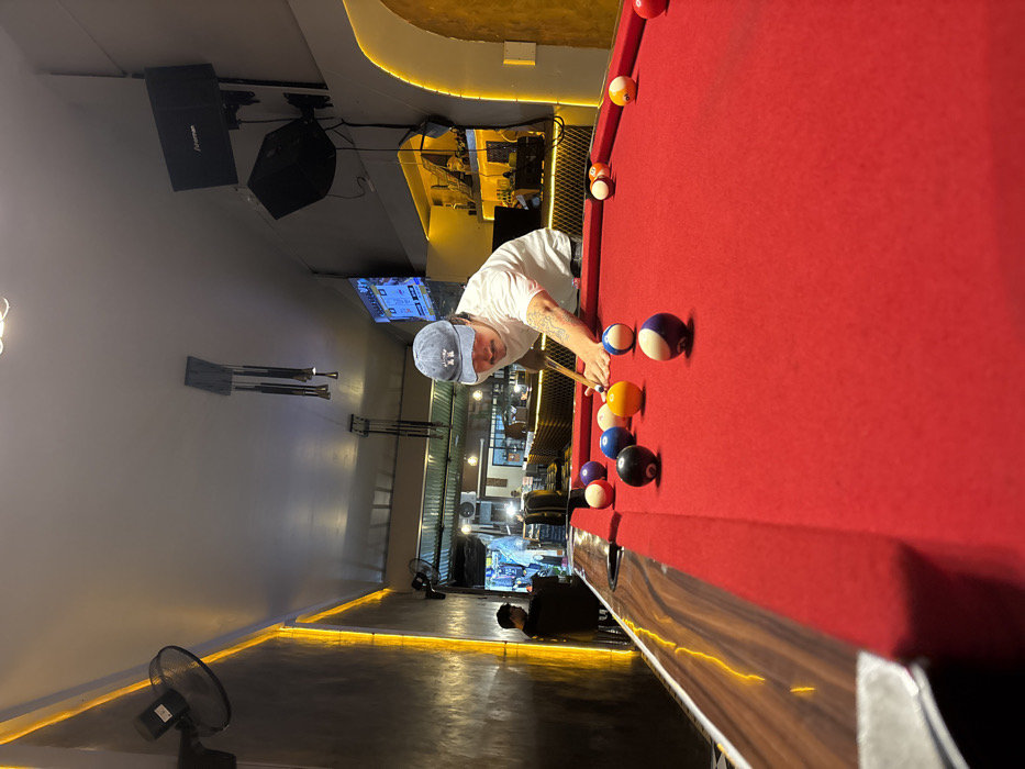 The image depicts an indoor scene within a bar or pool hall located in Pai, Thailand, illuminated by artificial light, suggesting evening or night