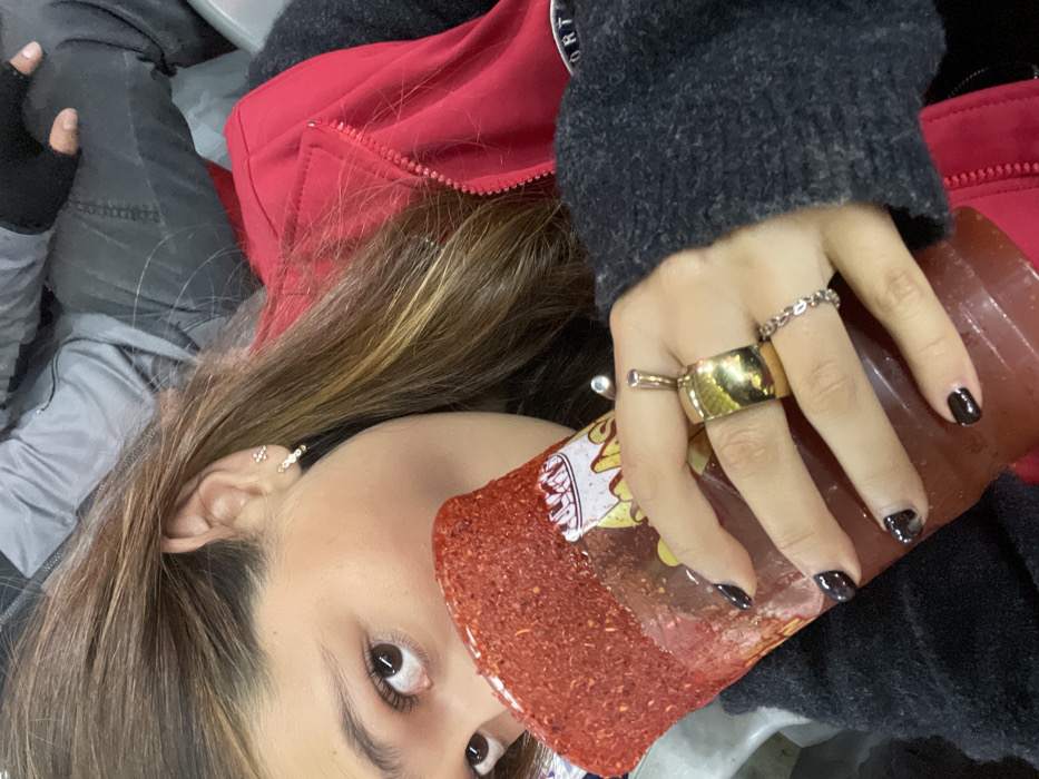 An individual is depicted in a close-up, partial view, seated in what is identified as a stadium or arena setting within the city of Toluca, Mexico. The subject's face is partially obscured by a large, transparent plastic cup. The visible portion of the face includes a brown eye looking directly at the camera and brown hair extending to the right. The individual is wearing a dark gray knit sweater layered under a bright red zippered vest. The right hand holds the plastic cup, which contains a reddish-brown liquid. The rim of the cup is heavily coated with a vivid red, granular spice mixture. The subject's fingernails are painted a dark shade. On the right hand, a wide, polished gold-toned band ring is worn on the ring finger, and a slender, silver-toned ring with connected circular elements is on the middle finger. Two small, light-colored stud earrings are visible on the right ear. In the blurred background, elements consistent with stadium seating are discernible, along with the arm and leg of another individual wearing dark gray attire and a dark glove.