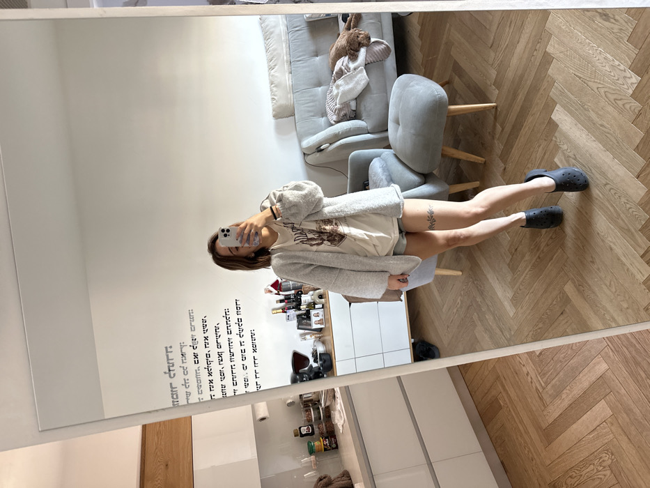 A female subject, with her face partially obscured by a smartphone held for a selfie, stands in a full-length mirror within a modern apartment. She wears a light grey open cardigan over a cream-colored graphic t-shirt, light blue shorts, and black clogs. A tattoo depicting a leafy branch is visible on her left thigh, and a black elastic band is on her right wrist. The reflected environment includes a kitchen area to the left, featuring white upper and lower cabinets, a light wood countertop, and assorted kitchen items such as jars, bottles, and a paper towel roll. To the right, a living space contains a light grey upholstered sofa with a folded striped blanket and a sleeping light brown poodle dog. A grey upholstered armchair and a matching ottoman with light wooden legs are also present. The walls are painted white, and the floor features a light wood herringbone pattern. Hebrew text, "כי מלאה הארץ דעה את ה' כמים לים מכסים" (Isaiah 11:9), is visible as a wall decal behind the subject. The scene depicts an interior residence in Rishon LeZion, Israel.