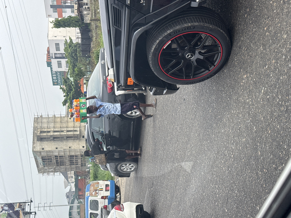 This image depicts a street scene in Ilado, Nigeria, under an overcast sky. The foreground shows an asphalt road with visible traffic. In the midground, a young male, appearing to be a boy, walks barefoot or in sandals towards the right of the frame. He wears a light blue short-sleeved shirt and dark shorts with a red logo (resembling Arsenal FC). He carries a green crate containing multiple bottles of beverages, likely sodas or juices, balanced on his head with both hands raised for support. To his left, another individual, dressed in dark clothing and carrying a camouflage-patterned backpack, stands beside an open driver's side door of a black Toyota Corolla sedan. This individual is also wearing sandals. Vehicles dominate the scene. In the immediate foreground, to the right, a black Mercedes-Benz G-Wagen is partially visible, featuring a large black wheel with a distinct red trim ring. Behind the boy and the Toyota Corolla, other vehicles are visible, including a white Mercedes car on the far left and a blue and white van further back. The background reveals an urban environment. A multi-story concrete building under construction, enveloped in scaffolding, stands prominently. Further right, a white building complex is visible, alongside a billboard with "QMB Lifestyle" text. Utility poles and overhead power lines are present against the sky. The overall scene suggests a busy roadside commercial area with ongoing development.