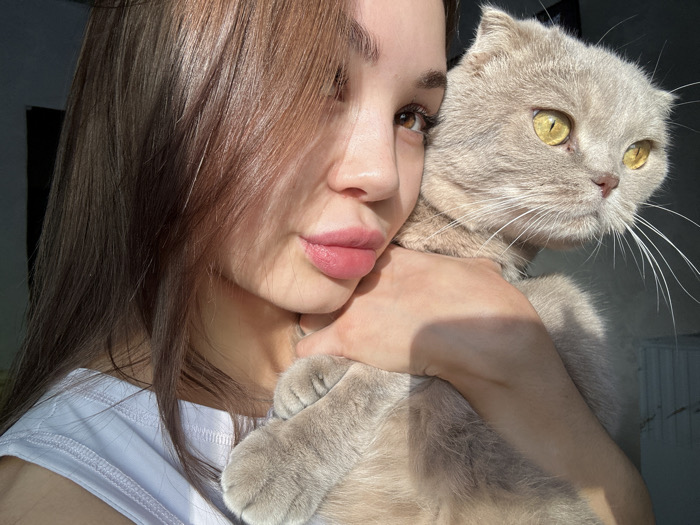A female individual is depicted in a close-up, indoor setting, holding a domestic cat