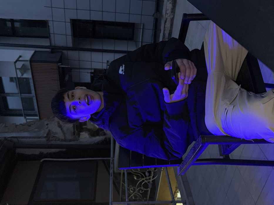 The image depicts a young adult male, estimated 16-25 years old, seated in a dark-colored chair outdoors at night. He has short dark hair and fair skin, and is looking directly at the camera with his mouth slightly open and tongue extended. The individual is wearing a black puffer jacket with a white 'FLAIR' logo on the left chest and light-colored cargo pants. He holds a dark-colored smartphone with both hands. A prominent blue light source illuminates the subject, particularly his face, chest, and legs. The background reveals an urban environment, likely an outdoor seating area such as a balcony or patio. To the left, a dark metal railing with decorative scrollwork is visible, behind which are parts of a building facade with a window and a textured, possibly damaged, wall. To the right and behind the subject, a building wall with a light-colored, tiled or paneled finish is visible, featuring a window and a small balcony. A dark table surface is partially visible in the lower right foreground. The specific location within the city of Stara Zagora, Bulgaria, is not discernible from the visual information presented in the image.