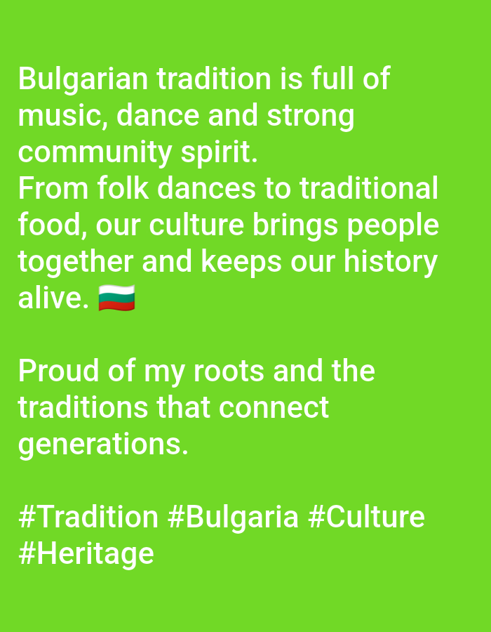 The image displays white sans-serif text on a solid bright green background. The text block begins with "Bulgarian tradition is full of music, dance and strong community spirit. From folk dances to traditional food, our culture brings people together and keeps our history alive." This sentence is followed by a Bulgarian flag emoji. A subsequent paragraph reads, "Proud of my roots and the traditions that connect generations." The final line contains hashtags: "#Tradition #Bulgaria #Culture #Heritage". There are no discernible people, specific objects (beyond the text and emoji), actions, interactions, or a visible physical environment or location within Kazanlak, Bulgaria, depicted in this image.