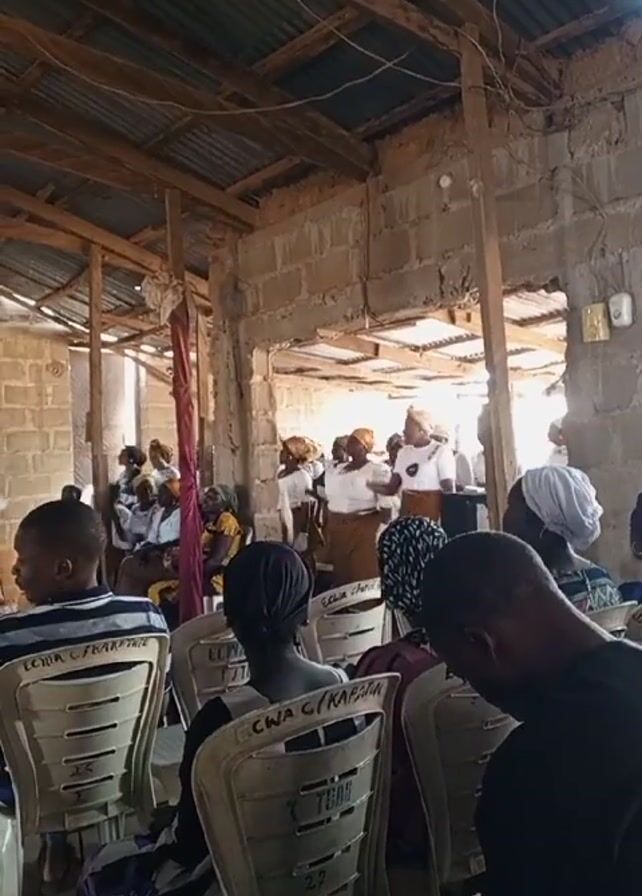 interior of what appears to be a church or meeting hall. A group of people, mostly dressed in white and brown attire with head coverings, are standing in a room separated by an opening in a cinder block wall, while others are seated in white plastic chairs in the foreground. The room has a simple, unfinished look with exposed brick walls, a tin roof supported by wooden beams, and a ceiling fan. People are generally focused on the standing group, suggesting they are performing or speaking. The seating arrangement is organized with chairs lined up in rows. Some chairs have labels with names written on them. The overall atmosphere seems to be religious or community-oriented.