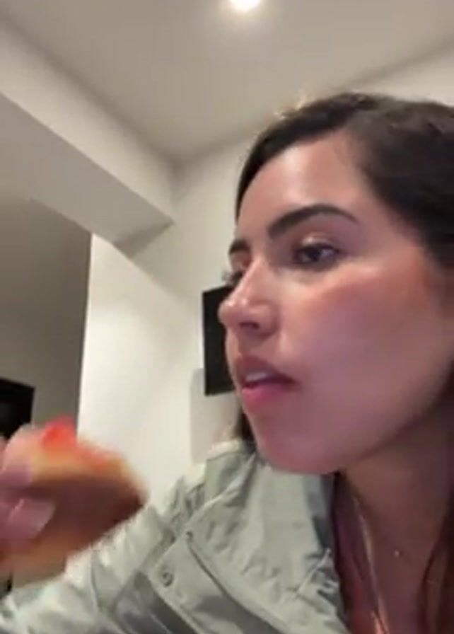 A woman is eating. The woman has brown hair and brown eyes and is wearing a light green jacket, a peach shirt, pearl earrings, and rings. She is holding a piece of food in her hands and taking a bite. The food appears to have bread on the bottom and tomatoes on top. The woman is inside a room with white walls and a light fixture on the ceiling. A dark television is visible on the wall.