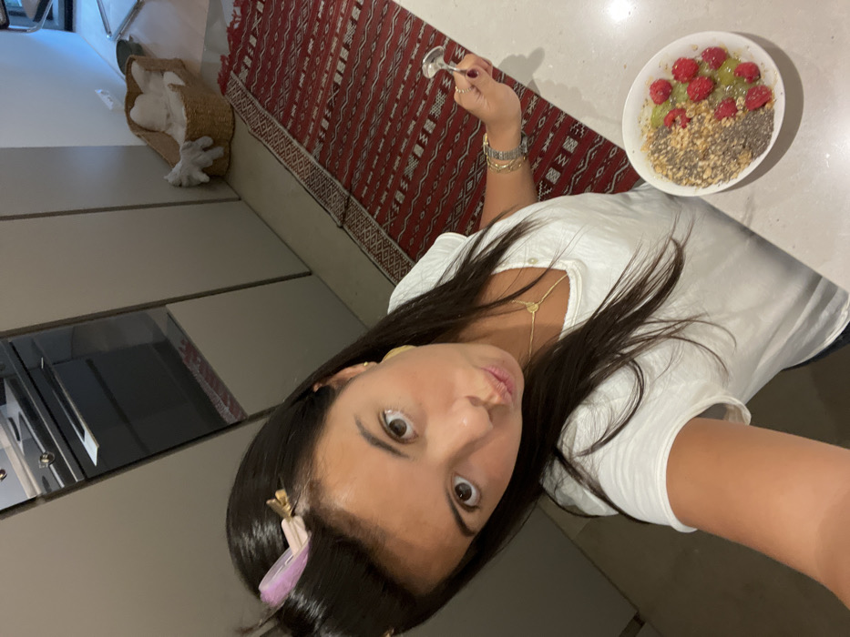 A young woman is depicted in a residential interior, specifically an indoor kitchen or dining area within Lordelo do Ouro e Massarelos, Portugal. She is taking a selfie, holding the camera with her right hand, which is not fully visible. Her dark hair is parted, with two hair clips (one pink, one gold) near her scalp on the left side of her head. She wears a white V-neck t-shirt, gold hoop earrings, a gold necklace with a circular pendant, and multiple bracelets including a watch on her left wrist. Her left hand, with dark nail polish, holds a silver spoon. In the foreground, on a light-colored countertop, rests a white bowl containing a meal composed of chia seeds, what appears to be crushed nuts or granola, green fruit pieces (possibly kiwi), and whole raspberries. The background features light grey wall panels or cabinets, with a reflection revealing a sink and faucet. A red patterned rug with white geometric designs covers a portion of the floor. To the right, a woven basket contains white items, suggesting a domestic setting. The woman's lips are pursed towards the camera.