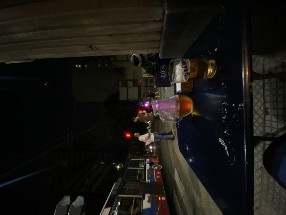Nighttime street scene with a blue table under a concrete structure. On the table, there is a beer glass with "Quilmes" branding and a pitcher filled with liquid, possibly beer or a cocktail. In the background, two men are standing on the sidewalk next to a brightly colored bus or trolley. Street lights and building windows are visible in the distance.