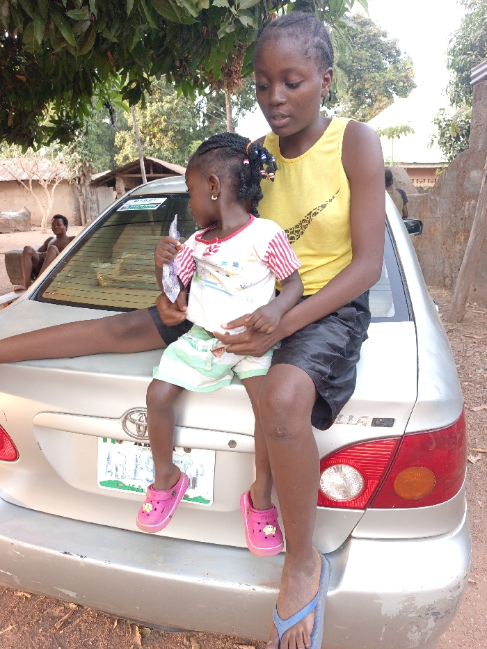 - "An outdoor scene in Akwanga, Nasarawa State, Nigeria, depicts an adult female and a young female child seated on the trunk of a silver Toyota Corolla sedan" by FM-B3Hcl1, licensed under CC BY 4.0