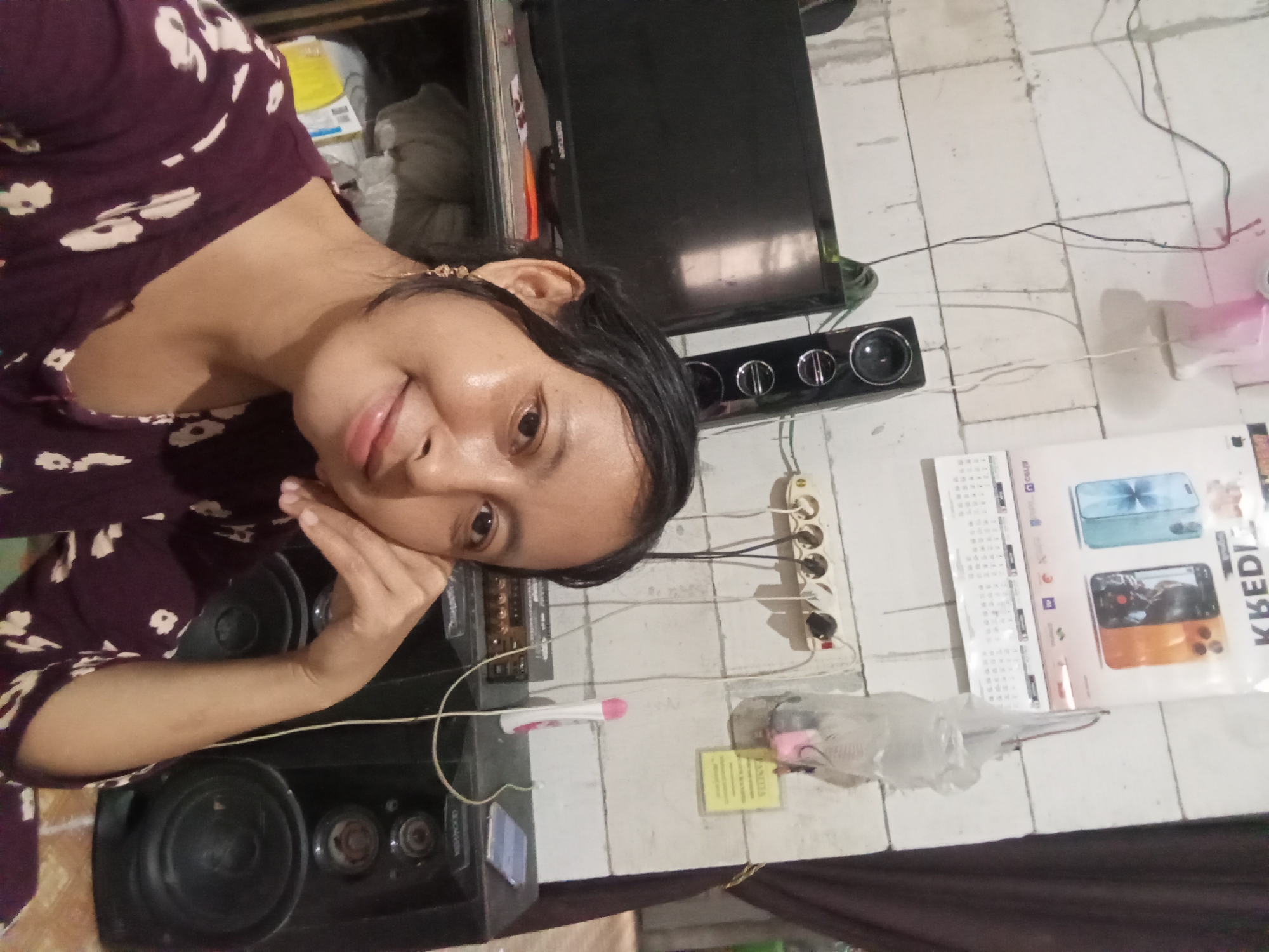 A woman is resting her face on her hand in what appears to be an interior scene. A large speaker is positioned near her face. In the background, a television, speaker system, and power outlet can be observed. A calendar poster hangs on the wall. The environment suggests an interior space in Baron, Indonesia.