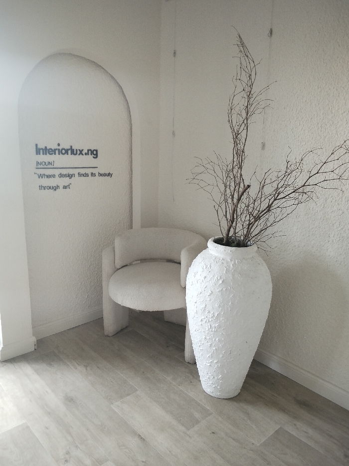An interior scene in Igboefon, Nigeria, displays a corner featuring textured white walls and a light-colored wooden floor. On the left wall, an arched niche is present, bearing the blue text "Interiorlux.ng" followed by "[NOUN.]" and the definition "“Where design finds its beauty through art.”" Positioned below this niche is a white, rounded armchair with textured upholstery. To the right of the armchair, a tall, white floor vase with a visibly textured, rough surface stands upright, containing numerous bare, dry tree branches that extend upwards from its opening. No individuals are present, and no active interactions are depicted.