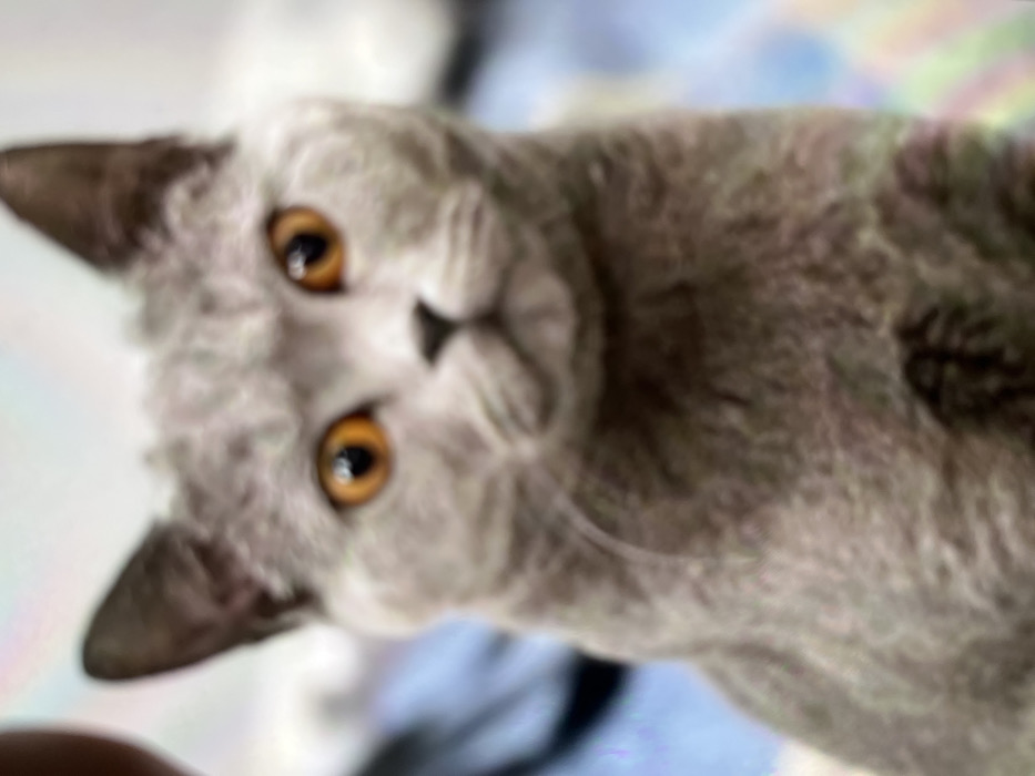 A gray Scottish Fold cat with striking golden eyes gazes intently at the viewer, its head tilted to the side. The cat's fur appears plush and slightly curled. The background is blurred, featuring hints of blue and light colors. The image's focus is sharpest on the cat's eyes, drawing attention to its curious expression.