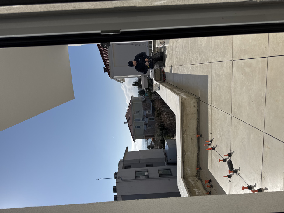 The image depicts an outdoor terrace under construction or renovation in Chernomorets, Bulgaria, observed from an interior doorway. The scene is illuminated by clear daylight under a bright blue sky with faint distant clouds. The foreground shows a light-colored tiled terrace floor. On the left side of the terrace, a pattern of numerous orange and black adjustable pedestals is arranged, some connected by dark lines, surrounding a dark square drain or grate. A low, unfinished concrete parapet wall, topped with matching light-colored tiles, separates the terrace from the external view. On the right side of the terrace, a male individual is kneeling. He is dressed in a dark beanie, a dark long-sleeved jacket, and dark work pants. His hands are engaged in an activity on the tiled surface, possibly involving tools or materials related to the tiling process. Two white buckets are positioned on the parapet wall near him. Beyond the terrace, a residential area of Chernomorets is visible. To the left, a multi-story light gray building with a flat roof and an antenna is present. In the center and right, residential-style buildings with light-colored facades and reddish-brown tiled gabled roofs are seen. Sparse, dormant vegetation is visible between the structures. In the distant background, a body of water, likely the Black Sea, is visible on the horizon beneath the clear sky. The overall perspective is framed by the white interior wall and dark door frame of the viewing structure.