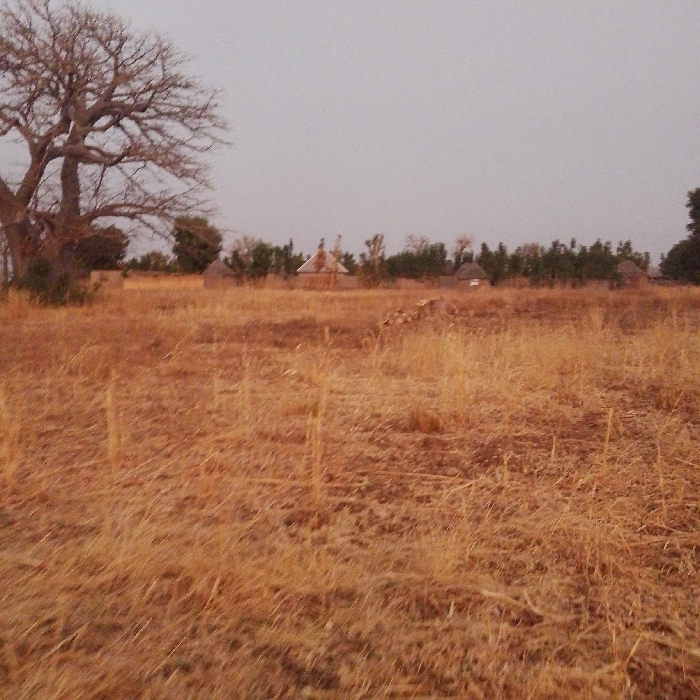 A landscape with a large, bare tree on the left. A field of dry, golden grass occupies the foreground. In the distance, structures resembling small huts with thatched roofs are interspersed with trees. The sky is overcast. The overall tone is muted and brown, suggestive of a dry season in a rural setting.