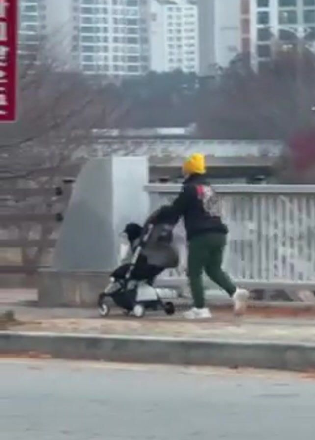 person pushing a stroller on a sidewalk. The person is wearing a yellow beanie, a black jacket with a design, green pants, and white sneakers. The stroller is black and appears to have a child in it. The background includes buildings, trees, and a fence. The video is filmed from inside a moving car.