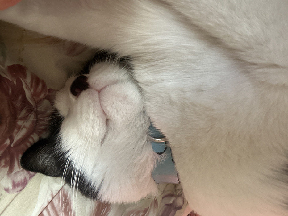A cat is sleeping on a floral patterned surface. Its head is mostly white with black markings on its nose and ear. The cat is wearing a blue collar. Its body appears mostly white and is positioned above its head. The cat’s eyes are closed, and it looks peaceful.