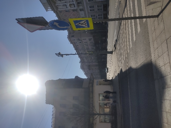 The image is taken from a low angle on a sunny day in Moscow, Russia. It shows a crosswalk with a pedestrian crossing sign and a blue turn-left traffic sign above it. The road is to the right of the frame, and the sidewalk is visible to the right of the road. A tall building is in the background on the left, with trees and some other lower buildings in front of it. Some people are walking near a building in the lower part of the image.